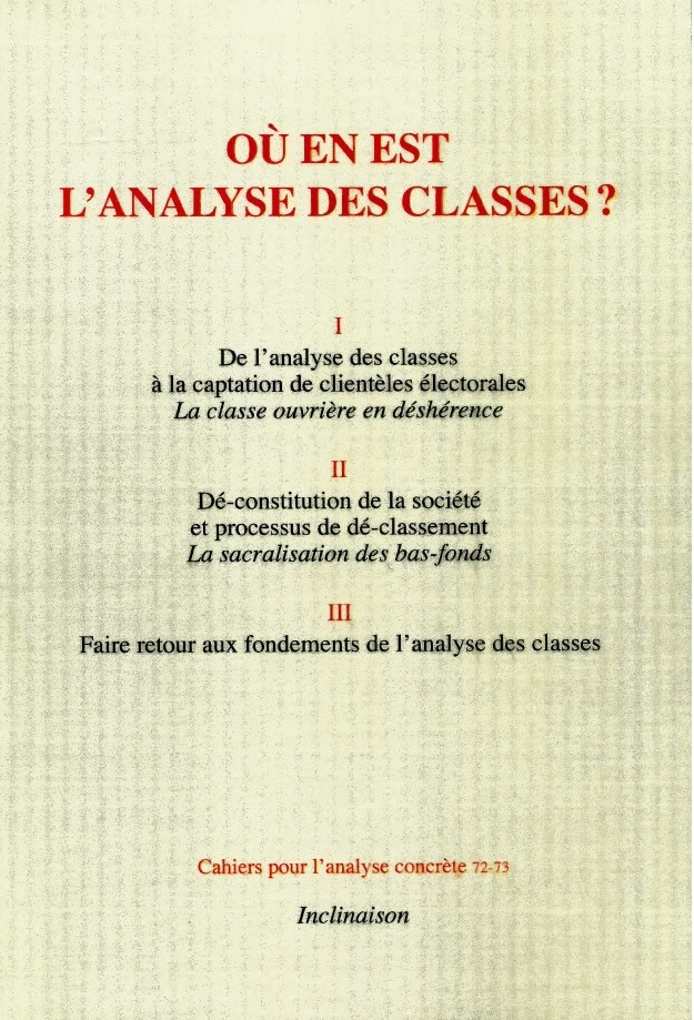 Dans la conjoncture actuelle, le plus souvent pour des motifs tenant aux échéances électorales, on note une réapparition sporadique de préoccupations relatives à la question des classes, le souci d’analyse n’y prévaut pas toujours. Les interrogations sont aussi portées sur la nature du “peuple”, sur les classes populaires, ne serait-ce que pour déplorer leur propension à s’égarer en matière politique, conduisant à envisager les mesures propres à une rééducation de leur “conscience”. Lorsqu’on ne met pas en doute l’existence même des classes, la règle la plus couramment suivie est de se centrer sur les représentations que l’on s’en fait, ou qu’elles sont supposées se faire d’elles-mêmes, ce qui revient à leur dénier toute réalité objective.